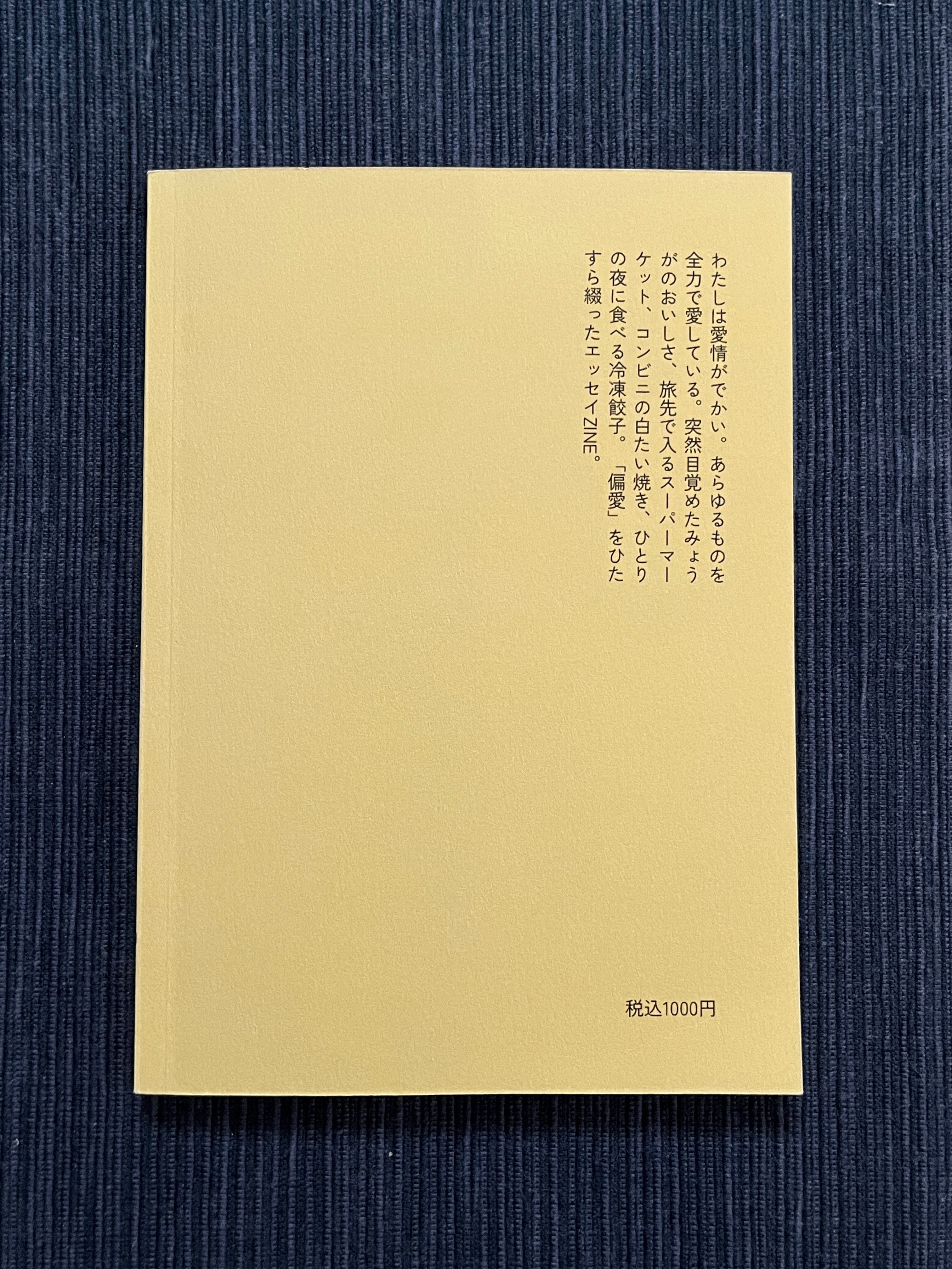 わたしは愛情がでかい。あらゆるものを全力で愛している。突然目覚めたみょうがのおいしさ、旅先で入るスーパーマーケット、コンビニの白たい焼き、ひとりの夜に食べる冷凍餃子。「偏愛」をひたすら綴ったエッセイZINE。