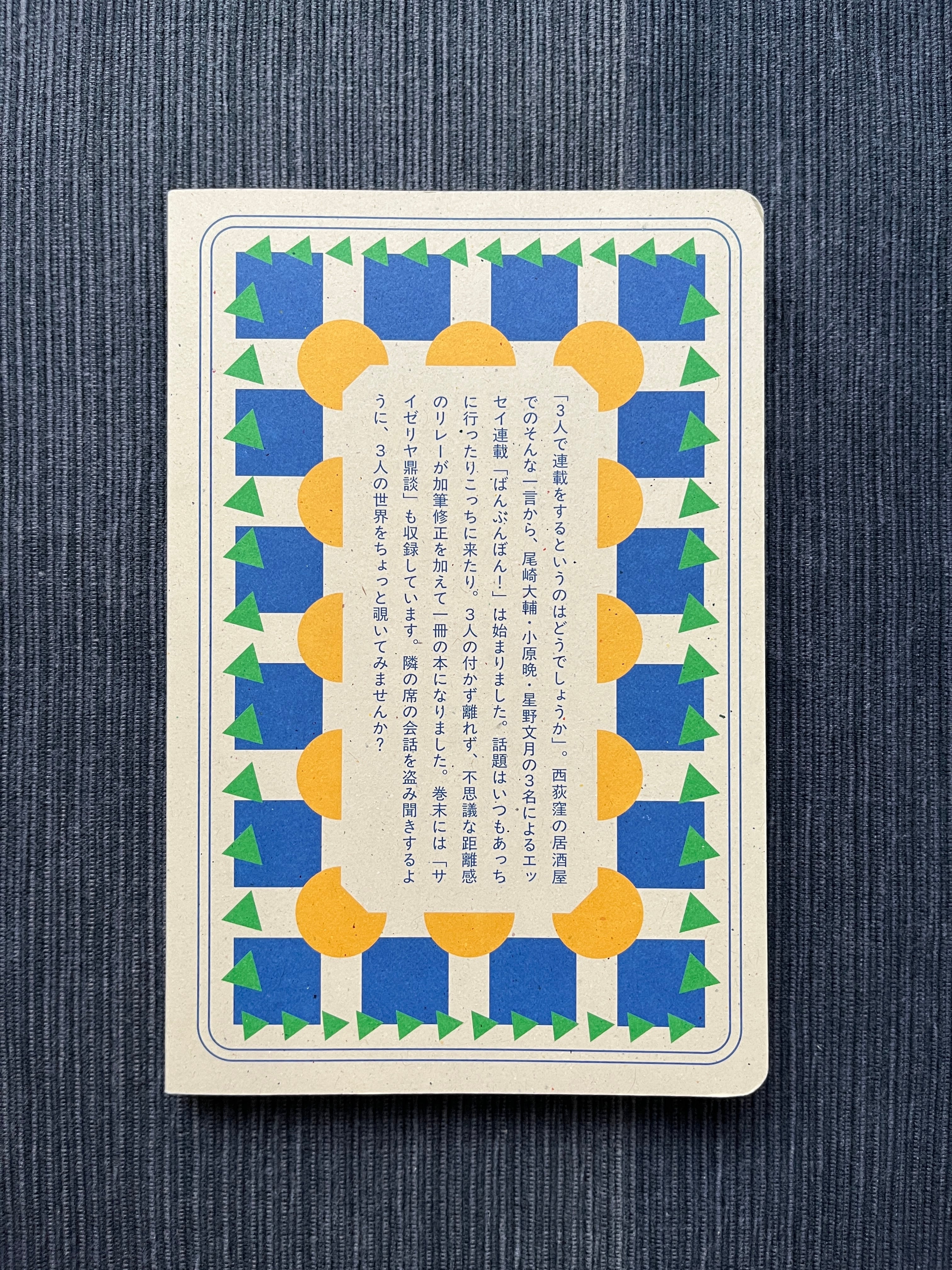 小原晩・尾崎大輔・星野文月の3人がそれぞれ書きたいテーマを持ち寄って、銘々思うように綴ったエッセイ集。巻末には「サイゼリヤ鼎談」も収録しています。