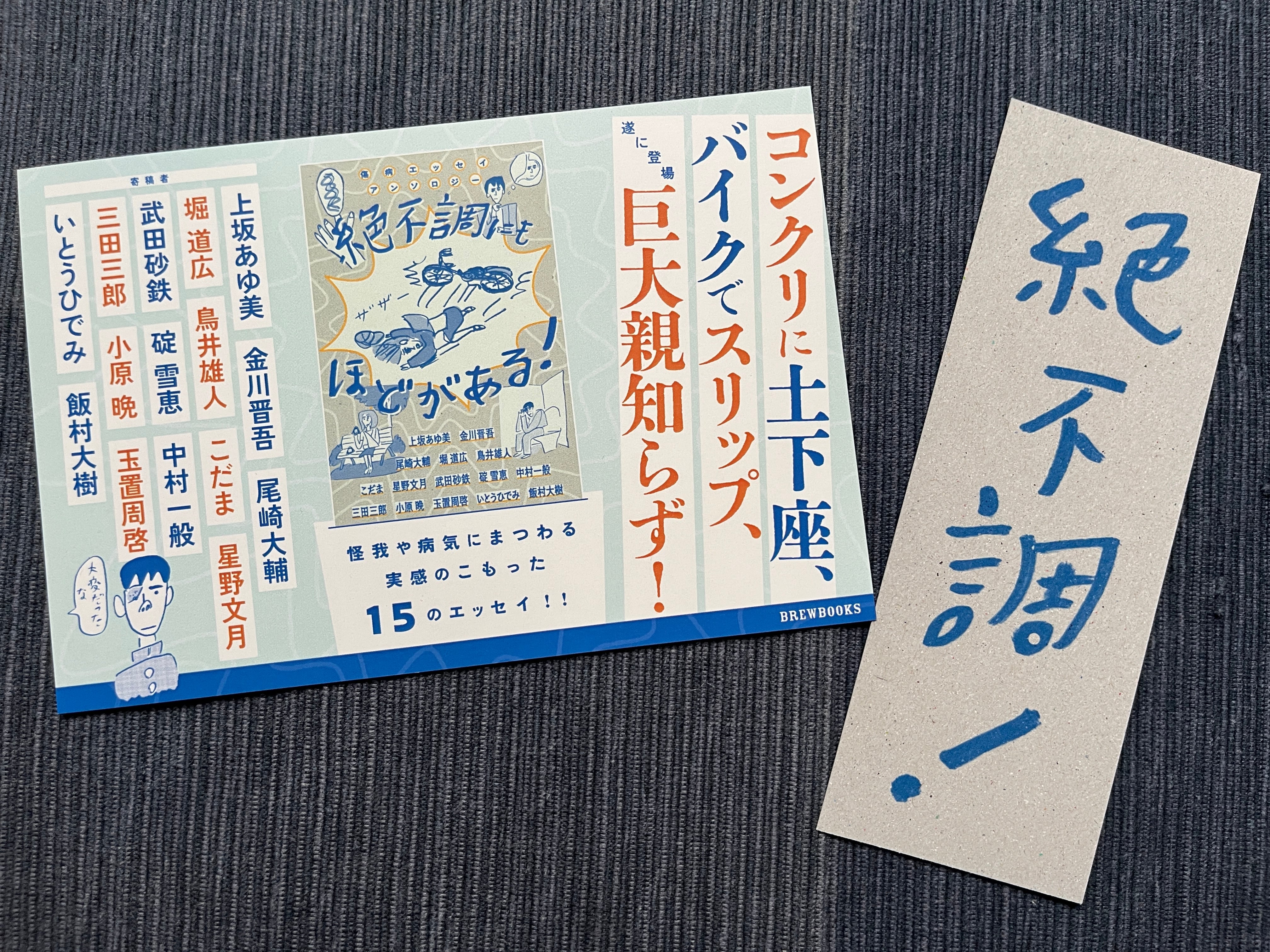 購入特典として、印刷工程で発生する表紙の余り紙を利用して作成された「絶不調しおり」も付属!表のデザインが2種類あり、どちらかをランダムにお付けします。