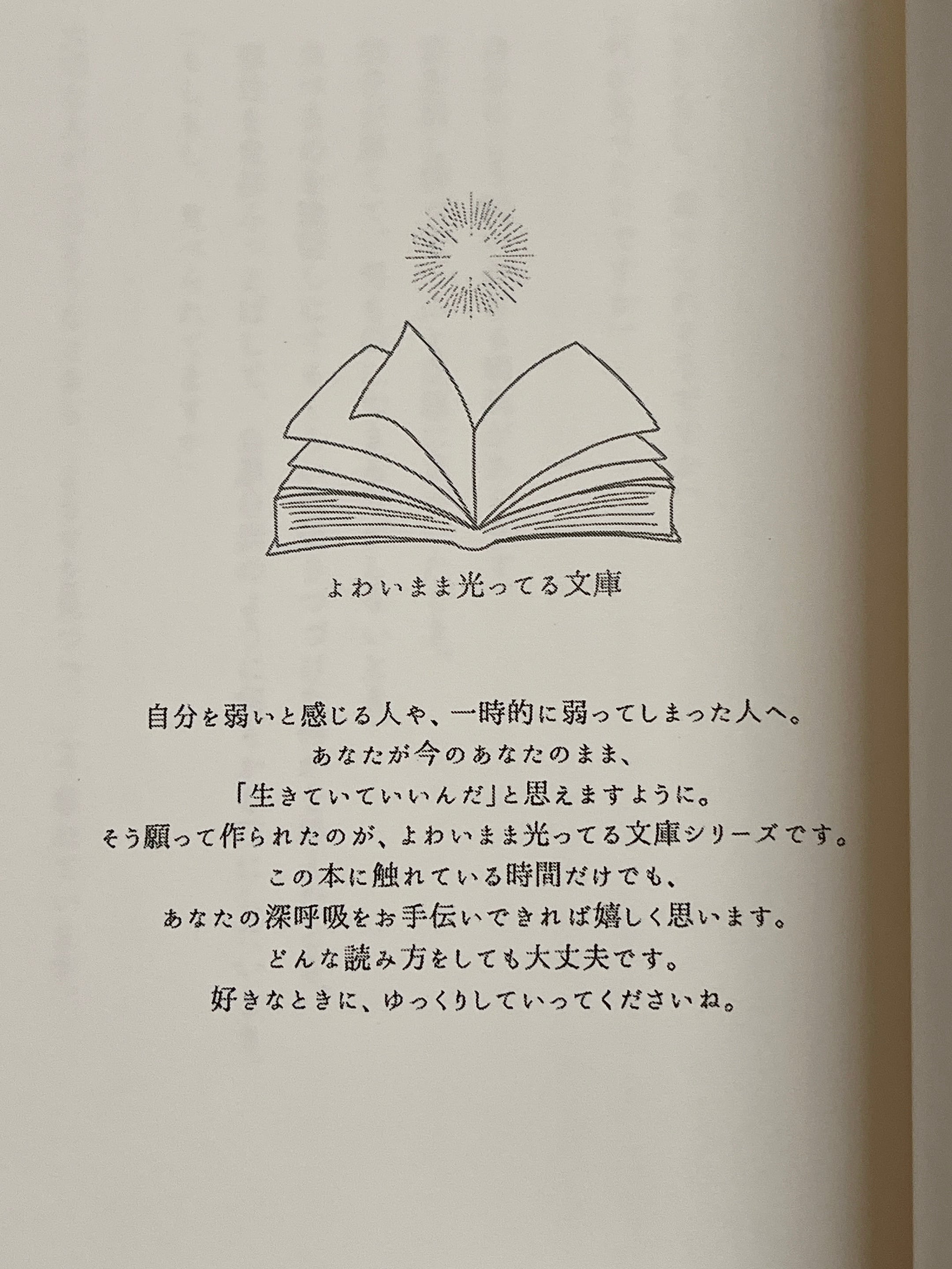 自分を弱いと感じる人や、一時的に弱ってしまった人へ。あなたが今のあなたのまま、「生きていていいんだ」と思えますように。そう願って作られたのが、よわいまま光ってる文庫シリーズです。この本に触れている時間だけでも、あなたの深呼吸をお手伝いできれば嬉しく思います。どんな読み方をしても大丈夫です。好きなときに、ゆっくりしていってくださいね。
